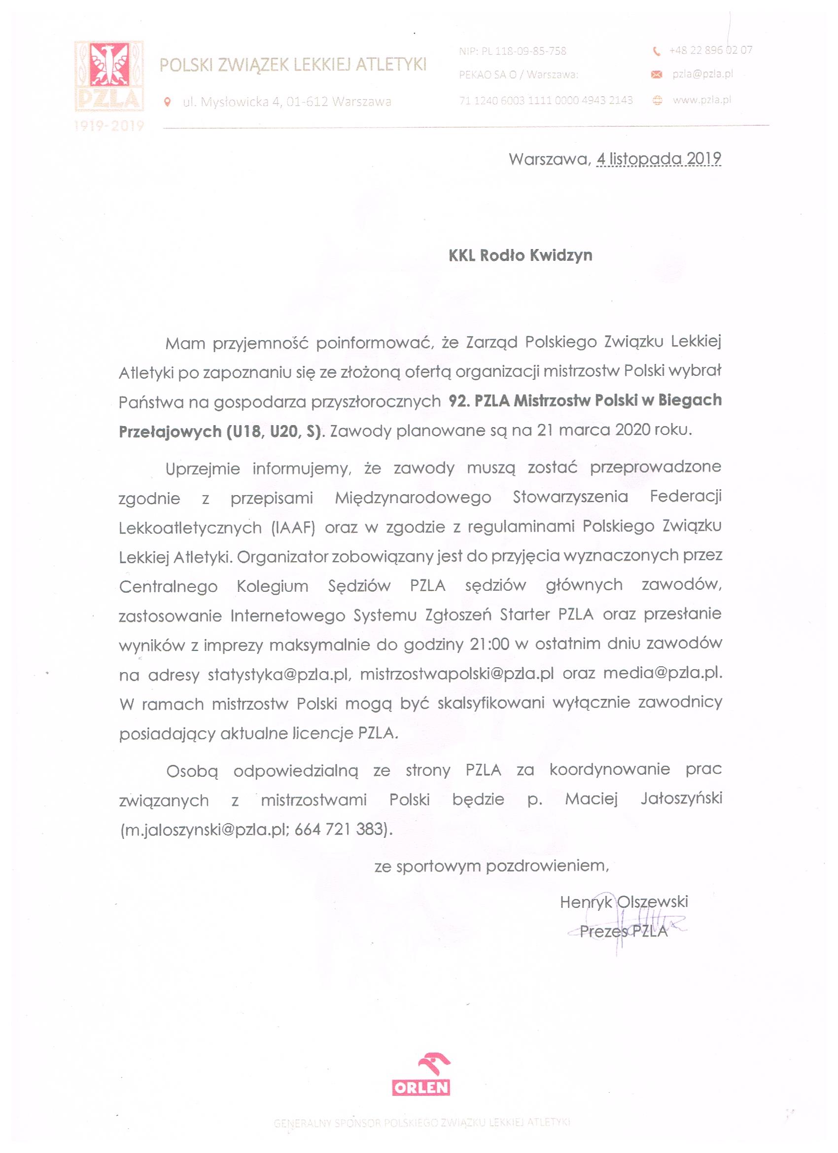 Miło nam poinformować, że po raz kolejny Kwidzyński Klub Lekkoatletyczny ,,Rodło” otrzymał prawo organizacji PZLA Mistrzostw Polski w Biegach Przełajowych juniorów młodszych, juniorów i seniorów, zawody planowane są na 21 marca 2020 r.